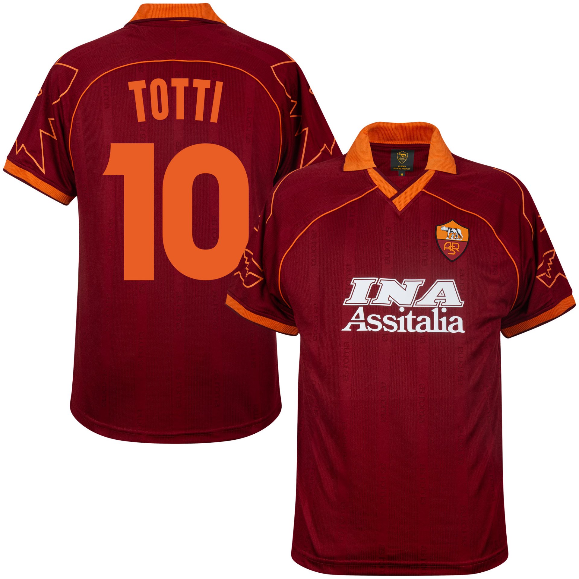 Maglia da calcio retrò AS Roma 1999–2000 di COPA Football dalla collezione ufficiale AS Roma. Sul retro è presente la stampa della leggenda dell’AS Roma TOTTI (10). Questa maglia retrò dell’AS Roma è ispirata alla maglia home indossata dall’AS Roma nella stagione 1999/00. La maglia da calcio retrò AS Roma ha maniche corte ed è realizzata nel tradizionale colore rosso scuro. È caratterizzata dal lupo romano arancione su entrambe le maniche. Il colletto polo e i bordini sono di colore arancione. Al centro del petto è riportato il nome dello sponsor dell’epoca, INA Assitalia. Sul lato sinistro del petto si trova il logo del club calcistico di Roma con il celebre lupo romano. Questa maglia dell’AS Roma è stata indossata da giocatori come Montella, Totti, Delvecchio, Cafu, Aldair, Nakata e altri grandi campioni.