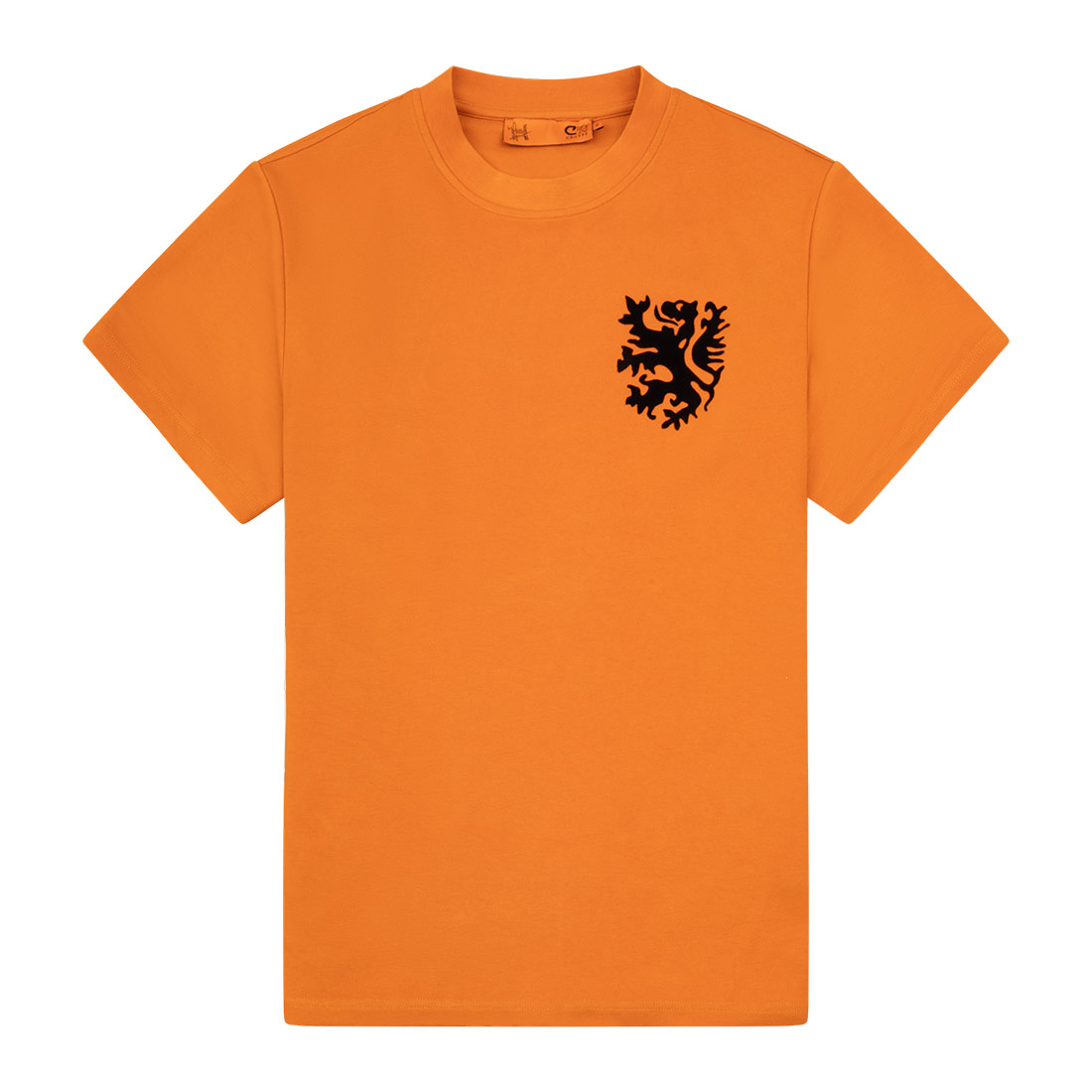 La T-shirt presenta maniche corte e un classico girocollo, offrendo uno stile senza tempo e un elevato comfort. Sul lato sinistro del petto è presente il leone olandese nero, simbolo forte e riconoscibile della nazionale.