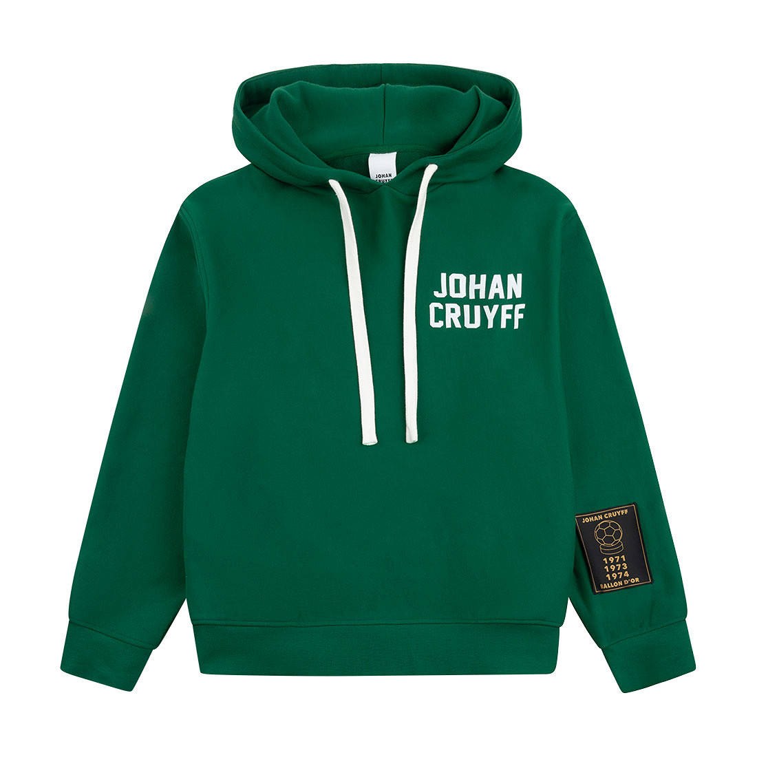 Felpa con cappuccio Johan Cruyff elegante in verde per adulti. Questa felpa premium è realizzata in 100% cotone French terry pesante e presenta una vestibilità rilassata per il massimo comfort. Sul petto è applicato un logo Johan Cruyff bianco. La patch Ballon d'Or sulla manica sinistra mostra gli anni in cui Johan Cruyff ha vinto questo prestigioso premio. Colletto e fondo a coste completano il design con un tocco raffinato e lussuoso. Un perfetto mix di comfort, stile e storia del calcio.
