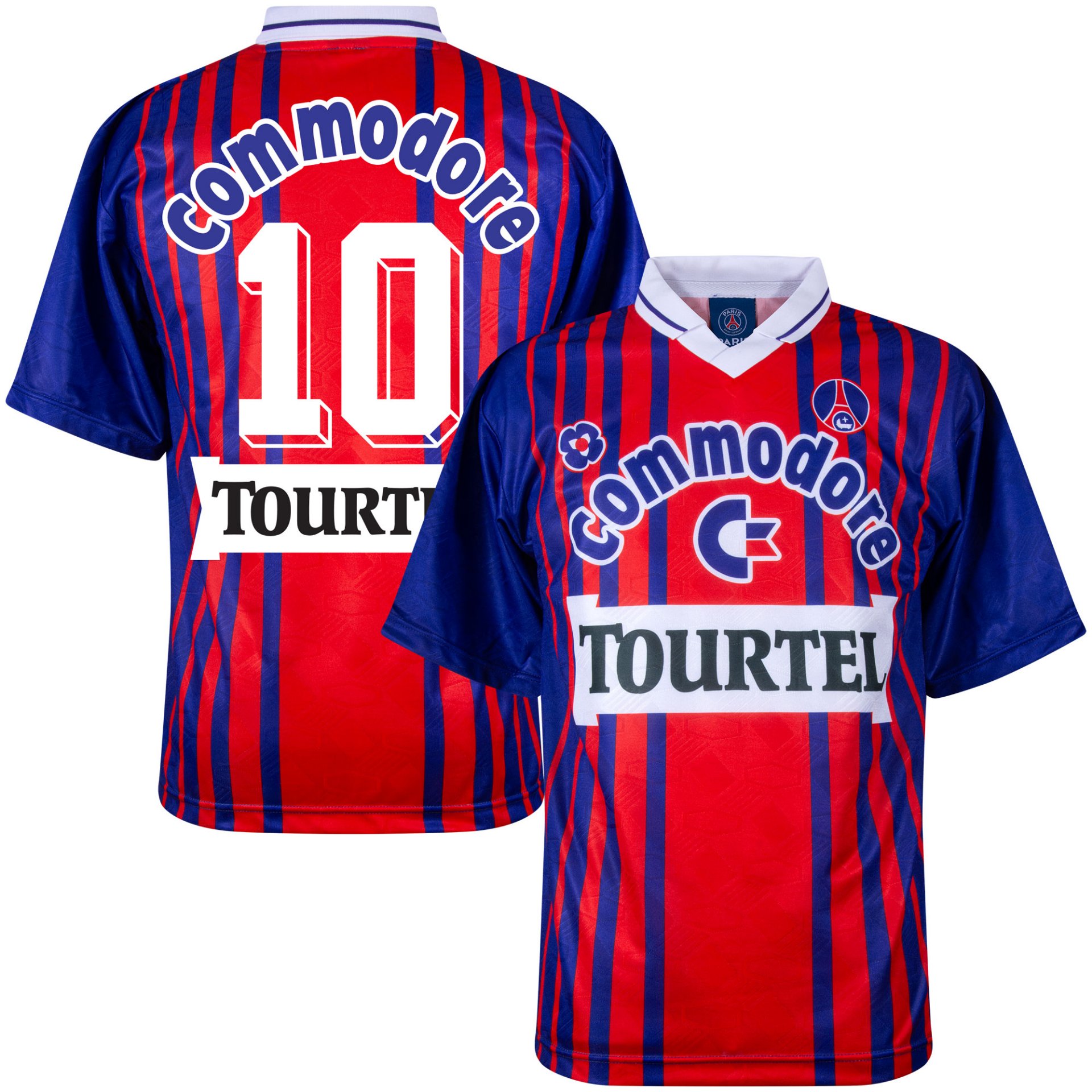 La maglia home retro PSG 1993-1994 presenta i tradizionali colori rosso e blu con le caratteristiche strisce verticali. I loghi storici degli sponsor Commodore e Tourtel sono al centro del petto, come nella versione originale. Sul lato sinistro si trova lo stemma ufficiale del club.