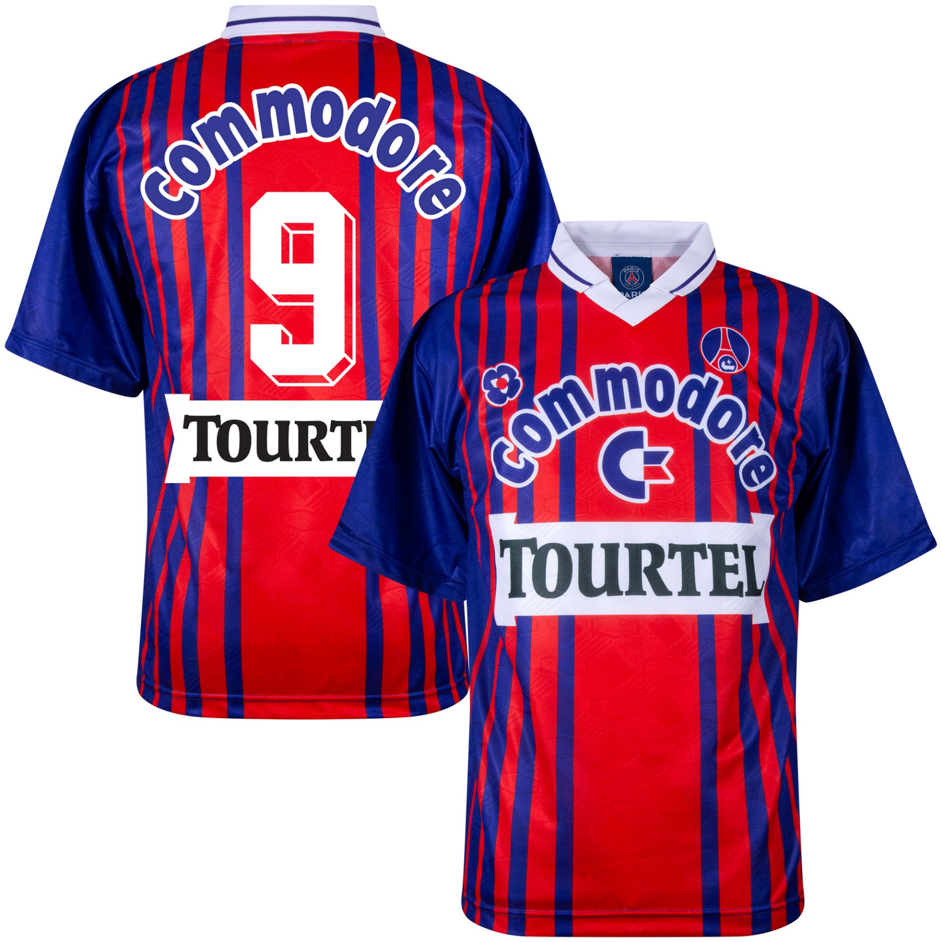 La maglia home retro PSG 1993-1994 presenta i tradizionali colori rosso e blu con le caratteristiche strisce verticali. I loghi storici degli sponsor Commodore e Tourtel sono al centro del petto. Sul lato sinistro si trova lo stemma ufficiale del club.