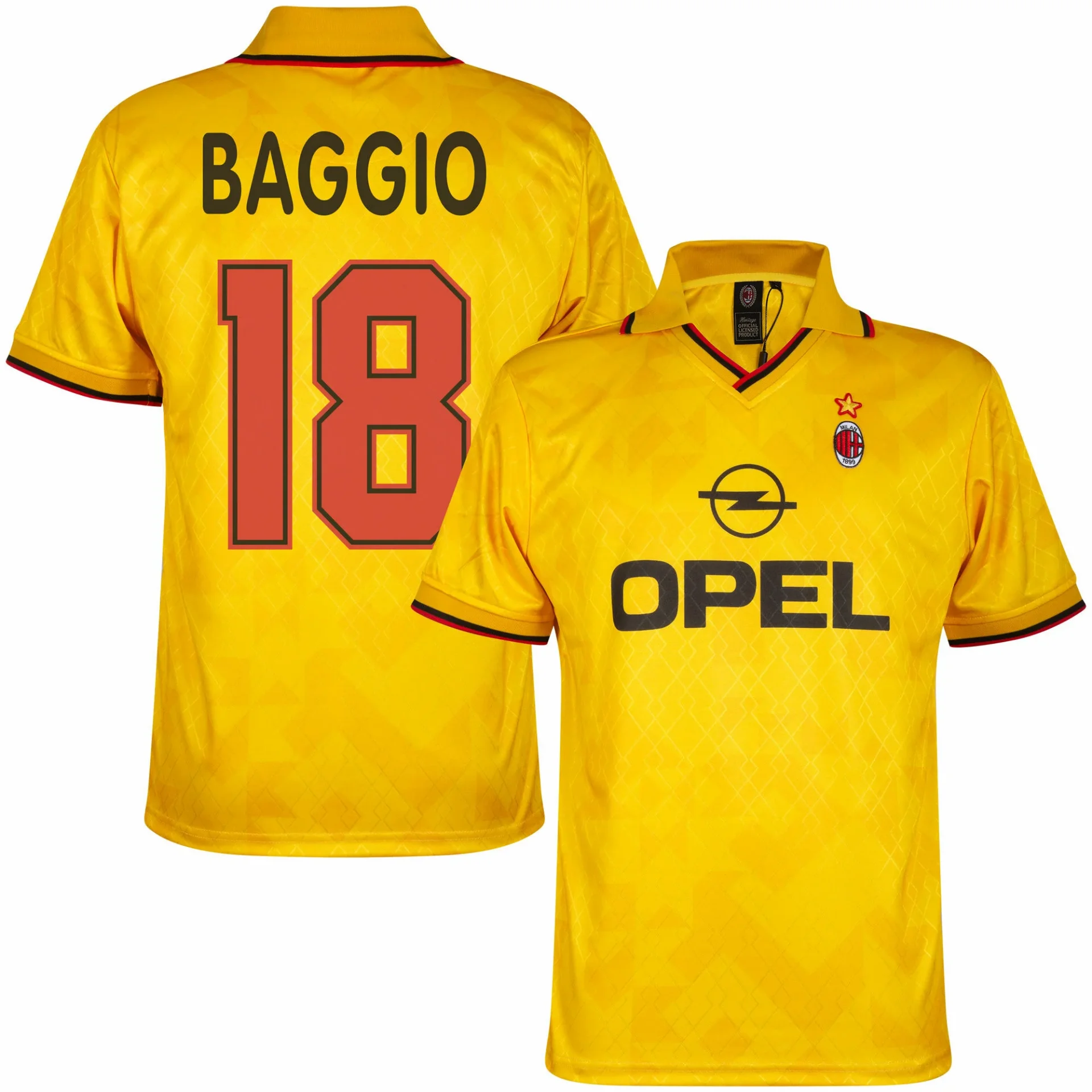 Questa è la terza maglia da calcio ufficiale dell'AC Milan 1995-1996. Il retro presenta la stampa di BAGGIO (18). Questa maglia da calcio retrò del Milan si basa sulla terza maglia da calcio dell'AC Milan della stagione 1995/96. La maglia da calcio retrò è prevalentemente gialla. Il nome dell'allora sponsor, OPEL, è stampato al centro. Il logo dell'AC Milan sul petto a sinistra è sovrastato da una stella dorata. Inoltre, questa maglia da calcio retrò dell'AC Milan presenta uno scollo a V e un colletto a polo con una linea rossa e nera. Anche il piping presenta questi colori. Una fantastica maglia da calcio dell'AC Milan per il vero tifoso del Milan! La maglia da calcio retrò dell'AC Milan di COPA Football ha una vestibilità regolare. Materiale: 100% poliestere riciclato.